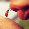 Description: Someone's pouting lips and a ladybug touching its front legs to them.